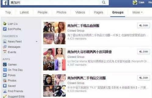 下图为在脸书上的小组搜索"南加州"