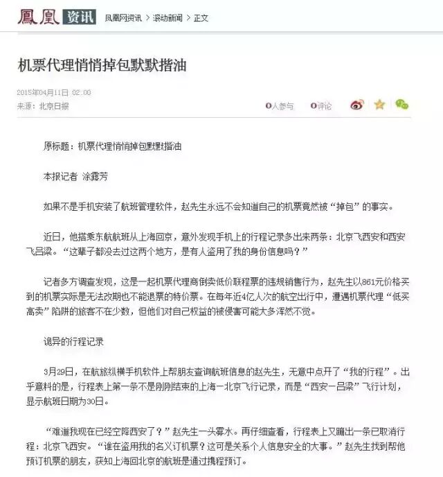 下图是去年报道的一则新闻,大概意思是:赵先生明明要订购"上海-北京"的直飞机票,实际购到的却是"上海-北京-西安-吕梁"的联程机票,而且完全是暗箱操作,客户从头至尾蒙在鼓里。