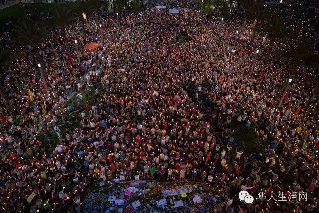 数万民众13日聚集在佛州奥兰多市中心,以烛光及鲜花悼念在Pulse夜店恐袭中罹难者
