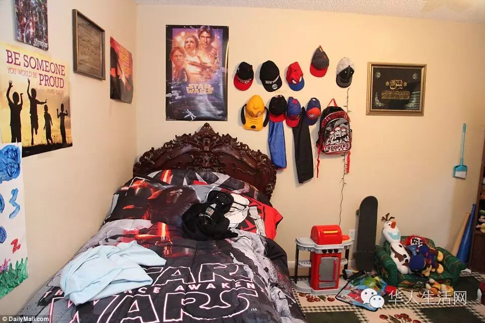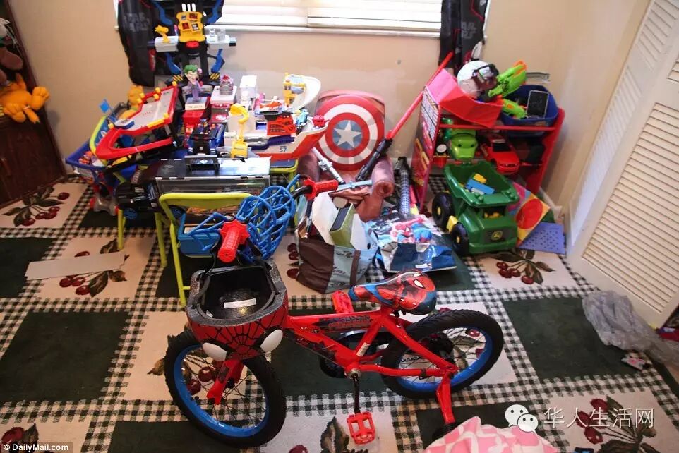 浴室是星战的主题,孩子的房间里有 忍者神龟的背包,还有蜘蛛侠自行车,米老鼠的海报。