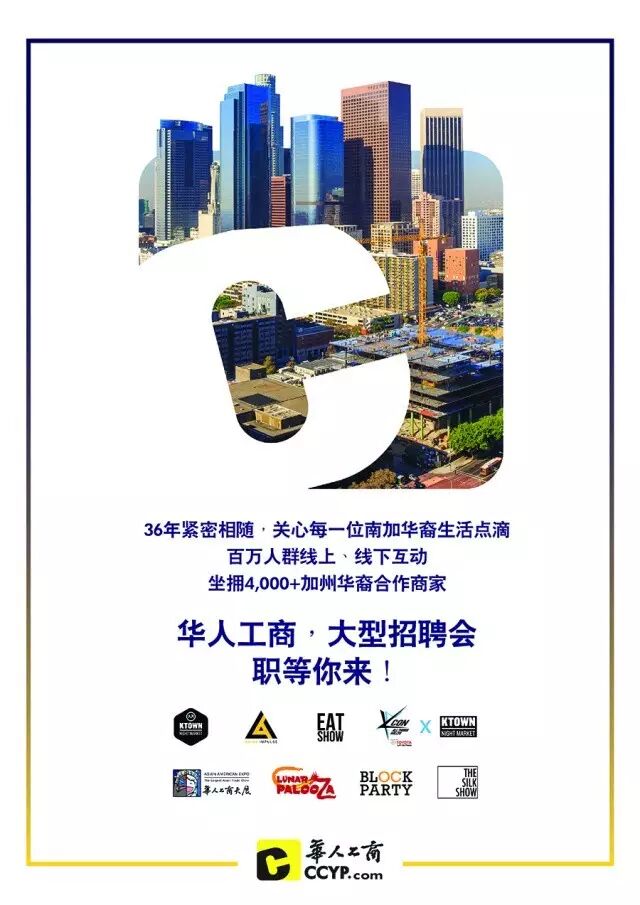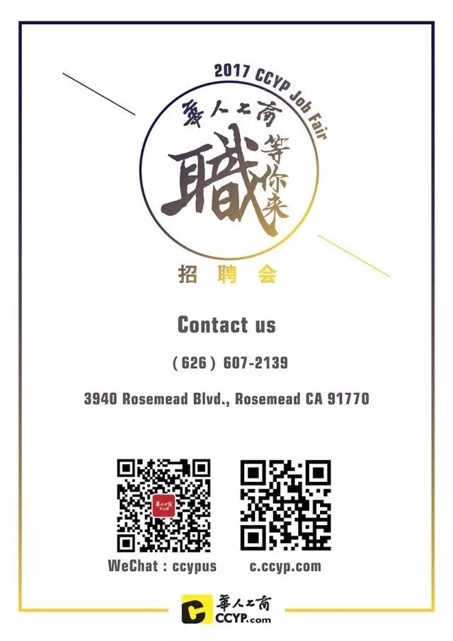 华人工商招聘会(CCYP Job Fair),是由CCYP.com旗下,分类网(C.CCYP.com)中的招聘板块延伸出的大型线下招聘会活动。网站每月累积百万点击量,每日不间断更新最前沿的招聘资讯。C.CCYP.com线上配合Google广告、SEO关键字优化、及多个社交媒体平台,将站内信息进行短时间、多途径、多范围的宣传;线下与众多商家资源进行筛选和沟通,整合有优质就业机会的实力商家,承办华人工商——“职”等你来大型招聘会。华人工商利用南加丰富的商家资源和影响力,广泛联合南加中国学生会等大型组织,全力打造“职”等你来大型招聘会。