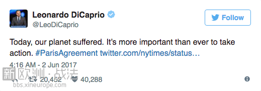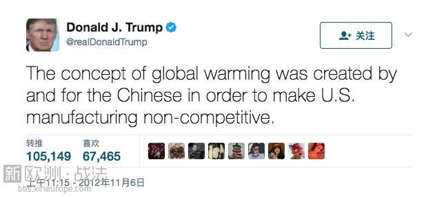 其实川普本人一直是反对巴黎协定的,去年他在竞选时的承诺之一就是上任后要退出这个协定。当年他的一个经典主张是什麽大家还记得吗?2012年的时候,川普就发过一条推特说:“全球气候变暖根本就是中国人捏造出来的概念,爲的就是要搞垮美国的制造业!”