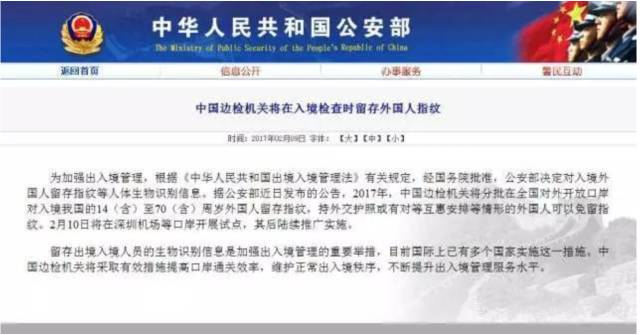 爲加强中国边境出入境的安全、数据化管理,经国务院批准,根据《中华人民共和国出境入境管理法》有关规定,公安部决定对入境外国人留存指纹等人体生物识别信息。