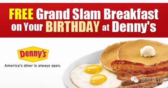 生日当天凭ID即可获得免费Grand Slam早餐(包括两个鸡蛋,两个pancakes, 两根香肠,两片培根)。