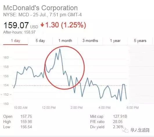 今天中午一过,全球最大的快餐连锁企业之一,麦当劳公司的股票,突然开始大跳水,直落1.3个百分点,市值在短短一个小时内,直接蒸发掉了一亿美元之多!