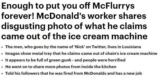 于是Nick和经理大吵一架,回去后第二天就收到了辞退信!气不过的他把这事发在了推特上,初衷就是想给大家提个醒,以后别吃麦当劳的冰淇淋了。