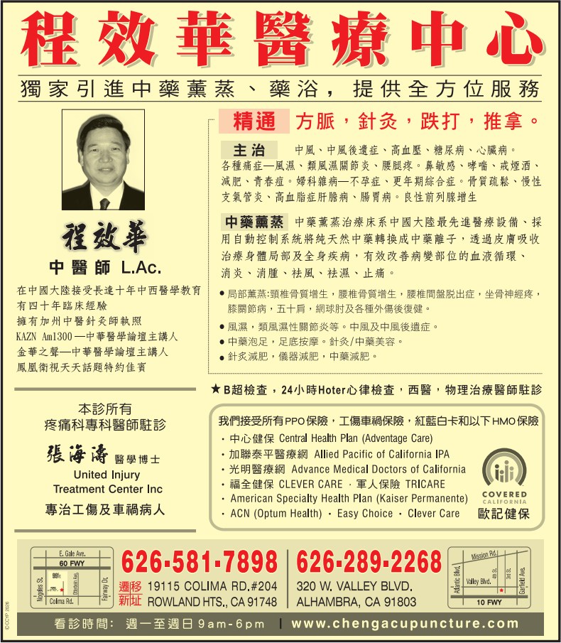程效华中医师联络电话:626-581-7898,罗兰岗医疗中心地址:19237 E. Colima Rd.,Rowland Heights,CA 91748;阿市诊所电话:626-289-2268,地址:320 W. ValleyBlvd. ,CA91803;网址:www.chengxiaohua.tyloon.info。