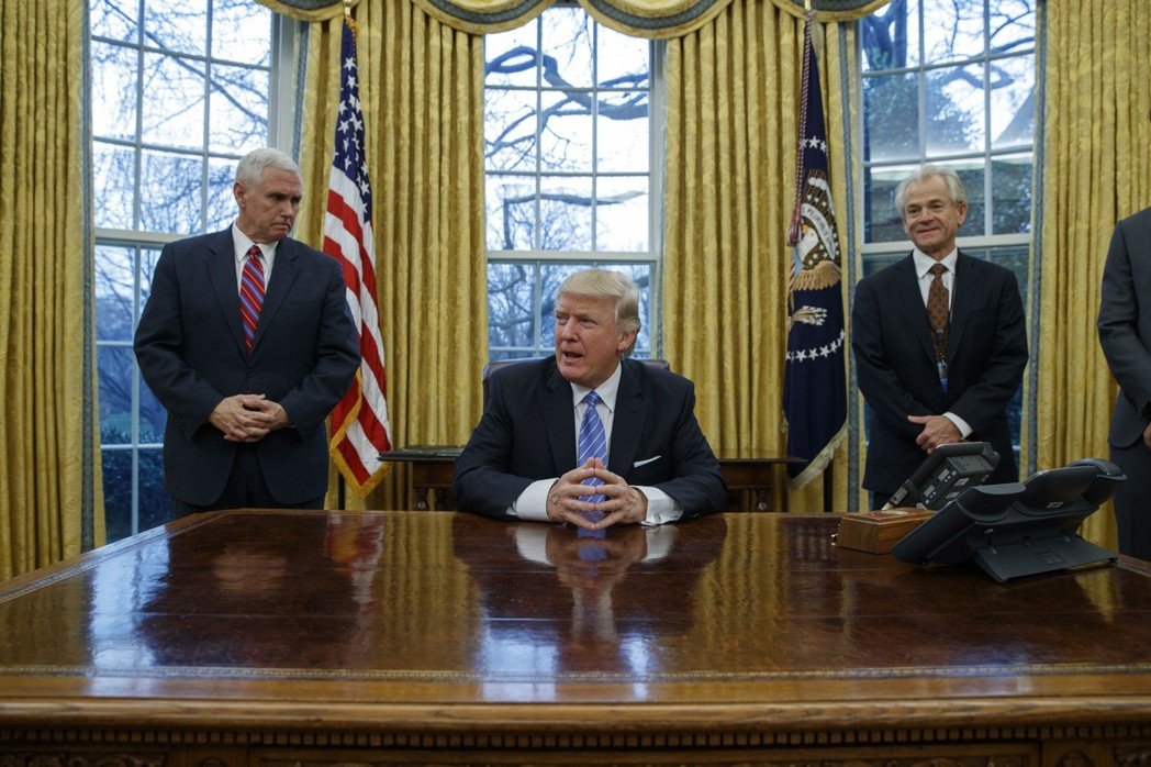 美国总统川普(中)去年初和贸易顾问纳瓦罗(右)及副总统潘斯(左)在白宫的档案照