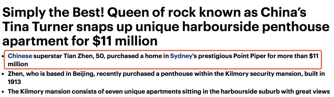 根据澳媒2016年的报道,田震在悉尼Point Piper花$1,165万澳币买下了一套顶层公寓。