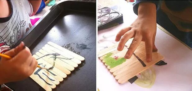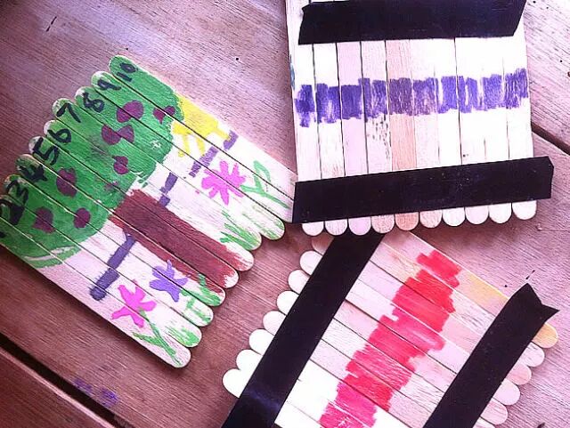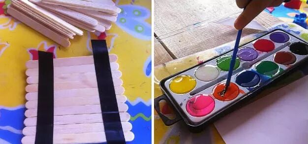 准备10根冰棒棍,用胶带将它们粘贴起来,保持冰棒棍表面平整哦!准备颜料,娃要脑洞大开,开始自创拼图啦!