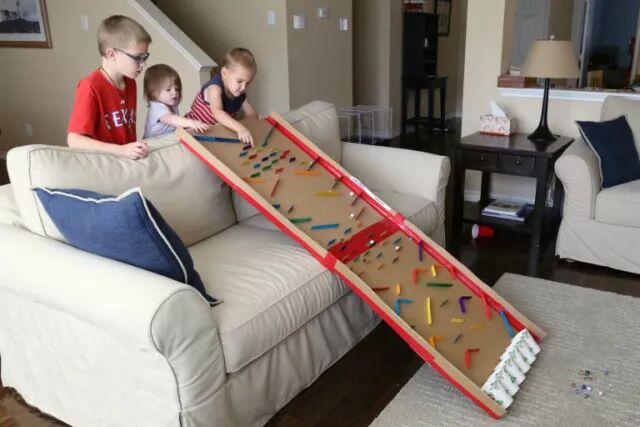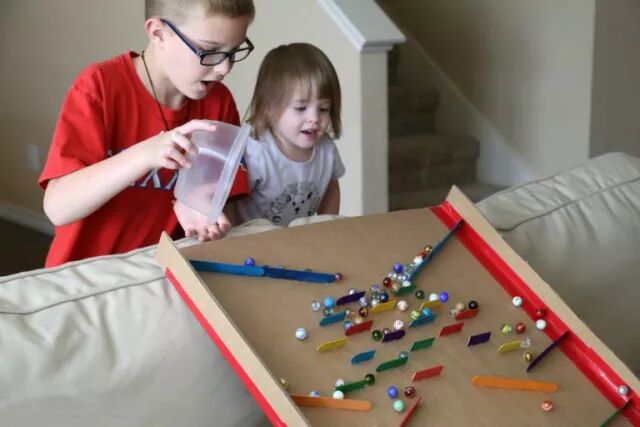 一轮游戏还不过瘾,年纪较大的哥哥将全部的弹珠尽全部倾倒啦,在冰棒棍之间滚动的弹珠就像行走在迷宫绕来绕去!