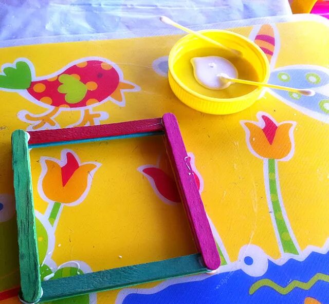 将浆糊倒入瓶盖中,用棉签将浆糊滴入冰棒棍的边角,慢慢地,一层一层的冰棒棍黏起来,储物盒的雏形就出现啦!这里娃可以挑选自己喜欢的颜色对储物盒进行色彩搭配哦!