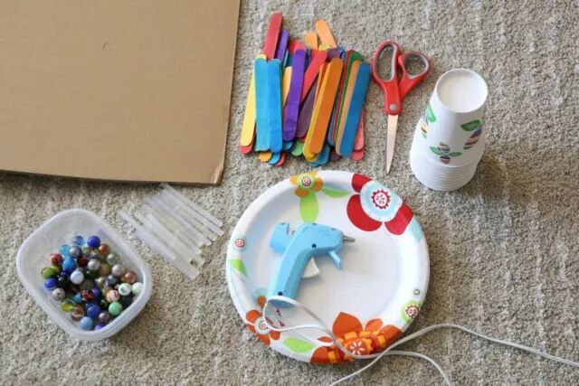 游戏很简单,需要准备的材料:冰棒棍,弹珠,剪刀,热熔胶,纸杯和胶带。