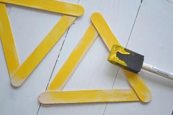 用刷子将冰棒棍刷成黄色!这里油漆颜色也可以换成娃喜欢的颜色哦!