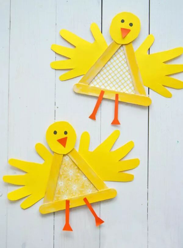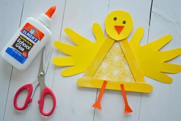 用剪刀在黄色的簿纸剪出三角形的形状,画出花纹,涂上黄色颜色后放在冰棒棍中,成为小鸡的身体。在黄色的卡片上,画出娃的手印,修剪出来,以此作为小黄鸡的翅膀。