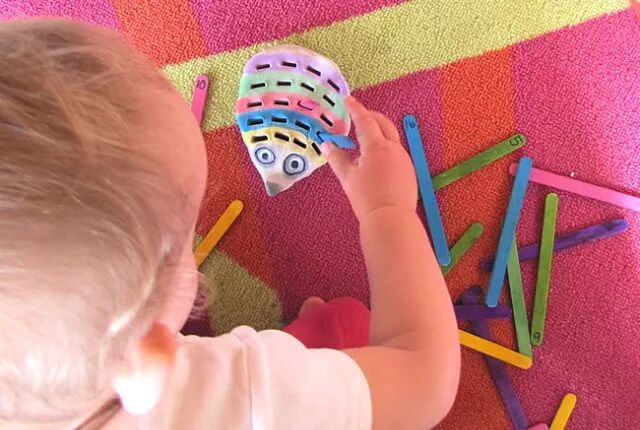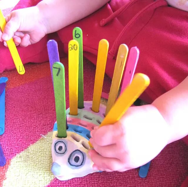 接下来是插入黄色的冰棒棍,宝妈可不要小瞧这样的动作,不仅能锻炼娃的精细动作,还能教他们识别数字哦!