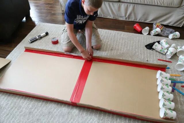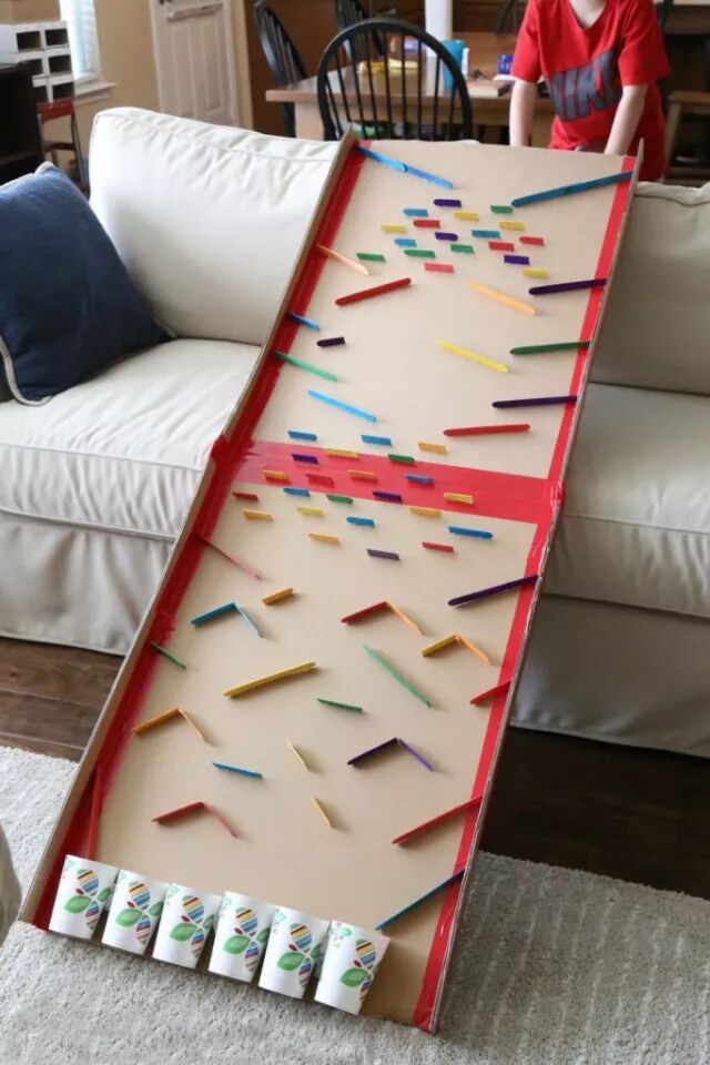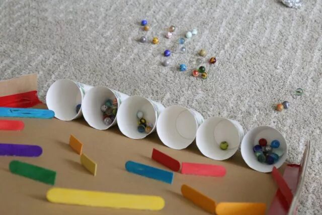 将彩色的冰棒棍粘贴在纸板上,错落有致的分布,迷宫效果会更好哦。将杯子粘贴到纸板底部,为了让弹珠能够平滑地滚入杯中,这里我们将杯口的边缘用剪刀剪切掉啦!