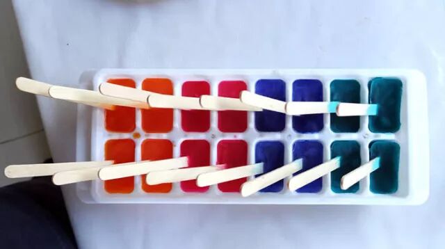 将冰棒棍斜放在冰棒模具盒中,放入冰箱冷冻!这里使用冰棒棍将更方便我们后期作画哦!