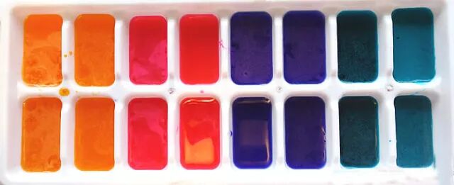Ready? go!将水倒入碗中,加入颜料或者食用色素,搅拌均匀后,将各色液体倒入冰棒模具盒中,这样就可以得到多种不同颜色的冰块啦。