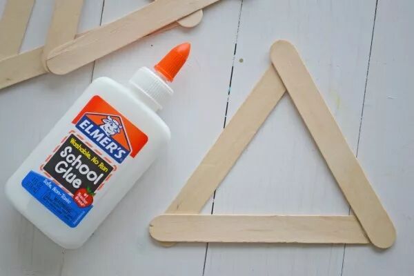 用三根冰棒棍搭建成一个三角形,并用胶水粘贴待其完全干燥。