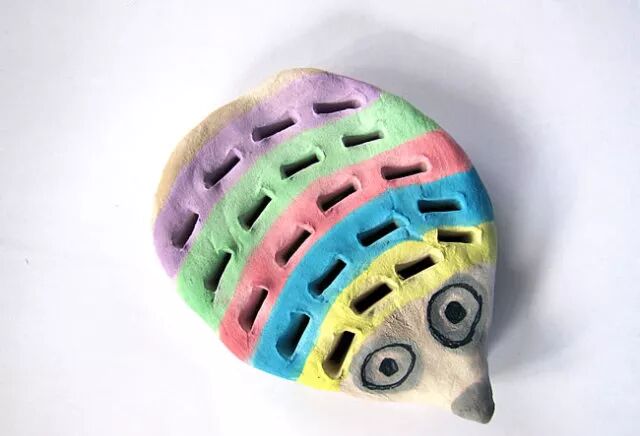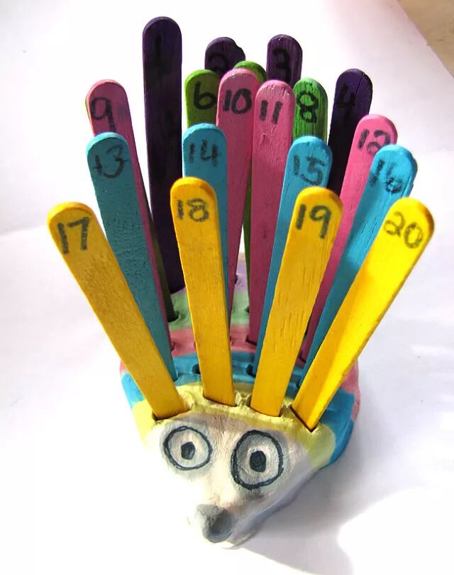 在刺猬背部准备20个插孔,每一排涂上与冰棒棍对应的颜色,用彩笔画出的眼睛和鼻子。它五颜六色、圆乎乎的模样有没有萌翻全场呢?