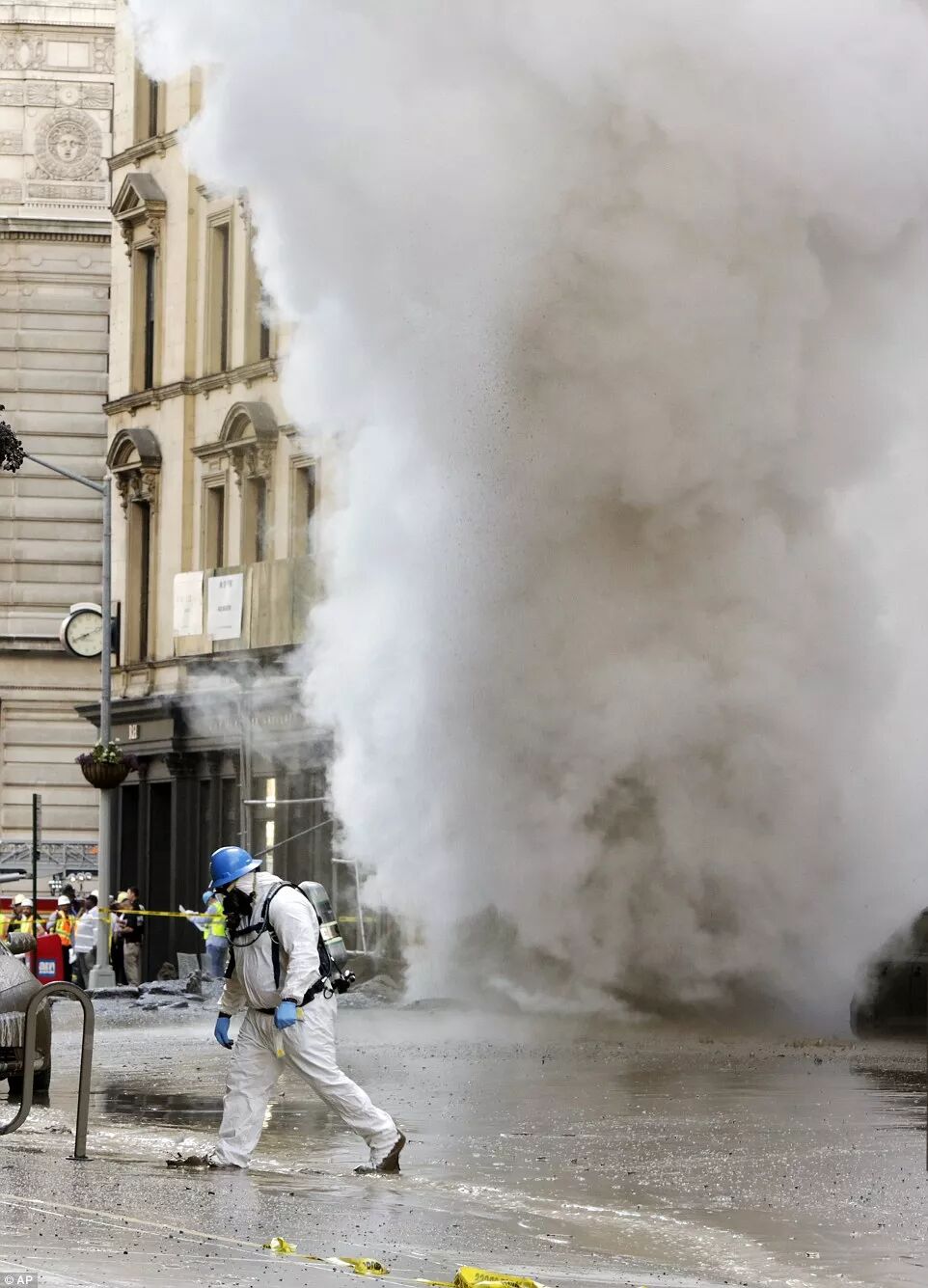 负责纽约市蒸汽管道系统的Con Edison公司负责人到现场检测空气污染指数,并告诫在附近活动的小伙伴、或接触到爆炸污染物的居民,请立即沐浴,并更换所有身上的衣物