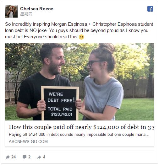 据ABC新闻报导,29岁的克里斯(Christopher Espinosa)与28岁的妻子摩根(Morgan Espinosa)在大学时期认识,就像美国的许多新世代,他们背负债务。美国教育部国家教育统计中心的数据指出,学生的总贷款额现为1.5万亿,平均每人债务超过2.8万美元。