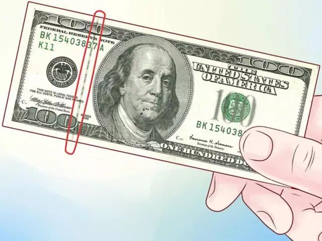 除了$1和$2的钞票外,所有面值的钞票上都有一条由上至下的安全线。安全线垂直嵌于美联储盖章右边的空白位置(而非印在钞票上)。安全线只有在光照情况下才能看到,灯光下,真钞的安全线应该很容易就能看见。