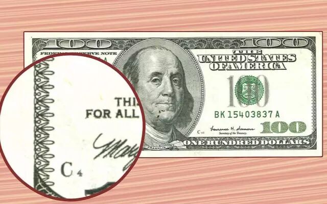 3. 与另一张相同版本、相同面额的真钞对比。不同面额的钞票有不同的特征,同面值的美金也出了好几个版本,因此需要一张相同版本和面额的真票作对比。