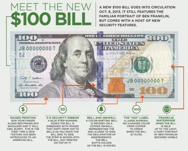 其实最喜欢的是这个版本的$100,因为很好识别(据说这是美国有史以来印制的最复杂的钞票),来说说它有哪些防伪标识!