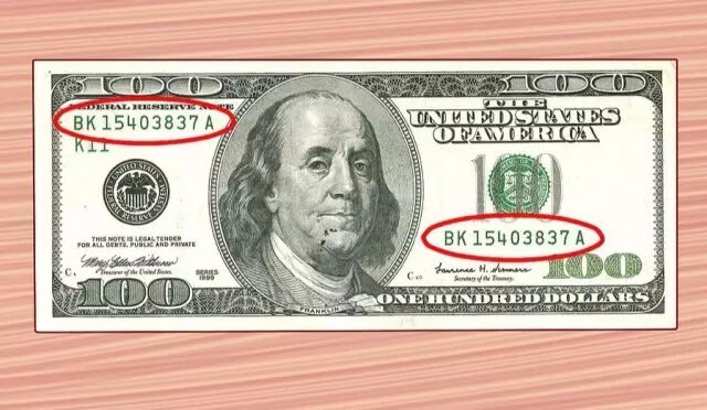 3. 钞票正面人像左右应分别有一个序号。仔细检查两个序号是否对应,假钞上的序号可能会排列参差,数字之间的间隔不一。