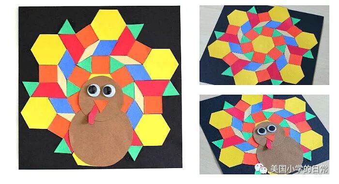 还有数学和美术结合的火鸡艺术,用不同的形状拼出五彩斑斓的羽毛,其中涉及的数学概念有: 几何形状(shape)和对称(symmetry), 是很好的学科融合作品: