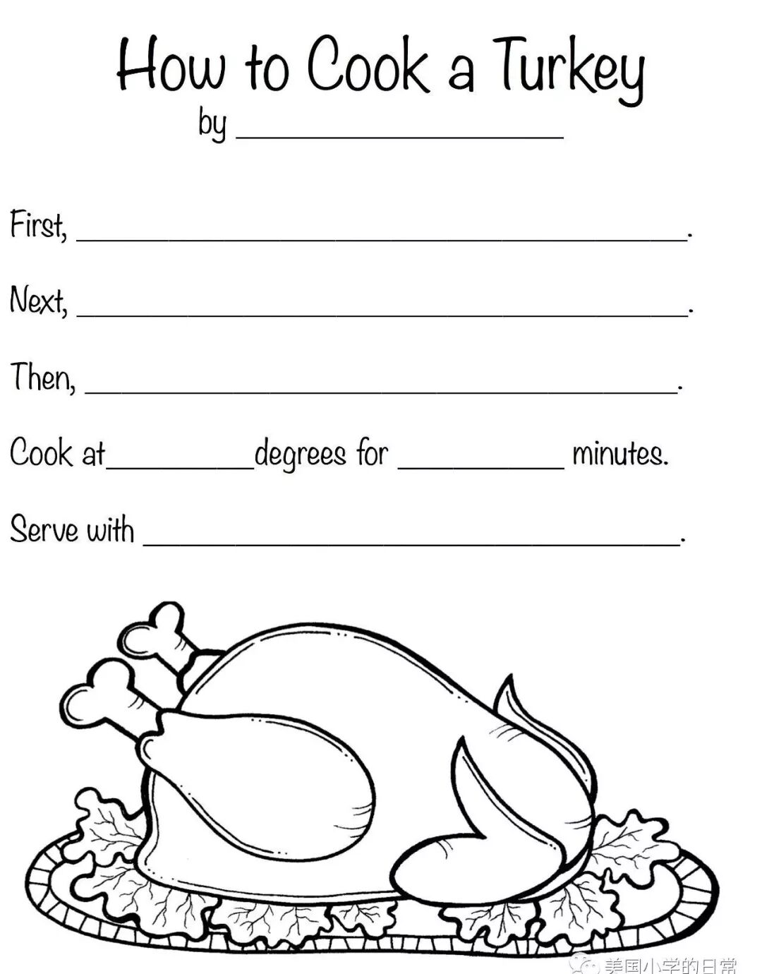 2)说明文中的“How to Writing”是美国小学低年级要求掌握的写作主题,感恩节之际,小朋友要写一写“How to Cook a Turkey(怎样做一只火鸡?)