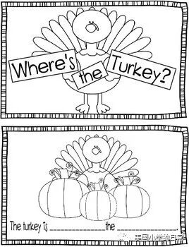 1)小书的主题是“Where is the Turkey", ��朋友们用学过的介词和方位词的知识,完成小书,并涂好颜色:
