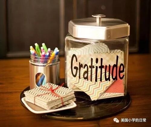 感谢的话不应藏在心里,而是要学着表达出来。美国老师会在教室里放上一个“感谢罐Gratitute Jar”,鼓励孩子将发生在身边值得自己感恩的话写在小卡片上,然后放在感恩罐子里。有的小朋友会写“感谢我的老师教会我很多的知识”,“感谢我的朋友帮我系鞋带”,“感谢我的妈妈给我做好吃的食物”等等。