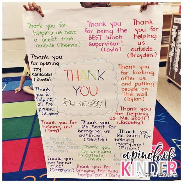 美国小学常常会有志愿者到教室来帮忙,这些志愿者有些来自邻近的高中,有的是社区大学的学生,还有一些是热心的家长。每个志愿者的离开,我们全班同学都会为Ta写卡片,并用班级基金买一个礼物送给Ta,因为我们希望孩子们能明白:给予比得到有时候更快乐!