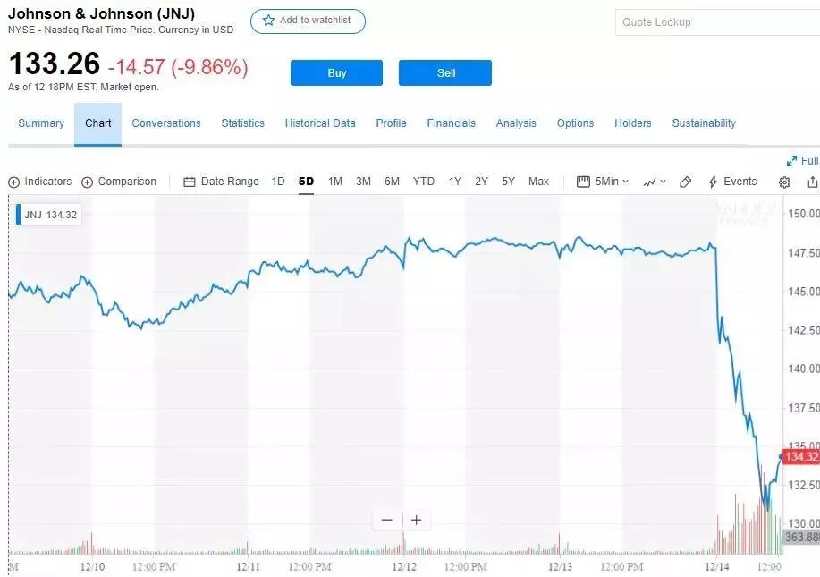 市场却立马给出了强烈反应。强生股价闻声大跌,美东时间12月14日,强生公司股价日内跌幅接近12%,创下2002年以来的最大跌幅,市值缩水一度逾450亿美元。