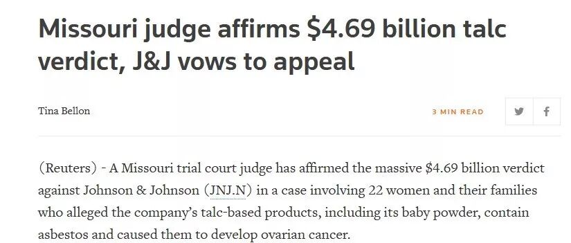 今年7月,密苏里州一个陪审团认定,22名女性对“强生公司的滑石粉制品包括婴儿奶粉中含有石棉,并导致她们患卵巢癌”的指控成立,责令强生支付5.5亿美元补偿性赔偿,以及41.4亿美元惩罚性赔偿。这是截至目前在滑石粉诉讼案中最高金额的赔偿。