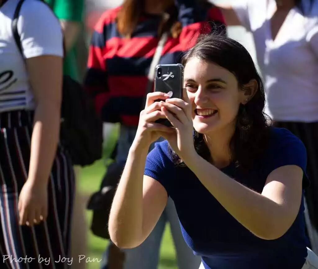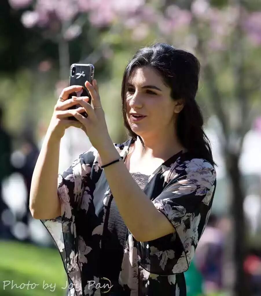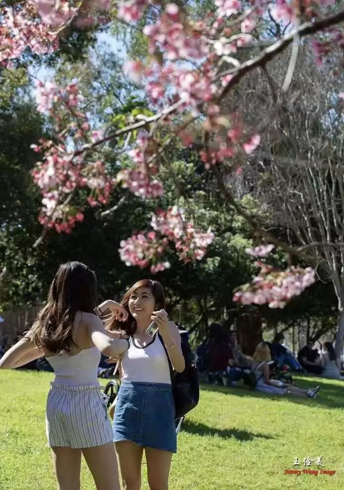 两位美眉在樱花树下互相拍照,自娱自乐了许久
