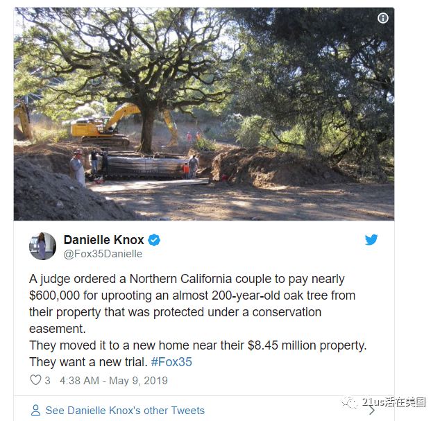 近日,美国加利福尼亚州北部的一对夫妻因无视相关土地管理规定,私自挪动自家院子里的古树而被罚款近60万美元(约合409万元人民币)。