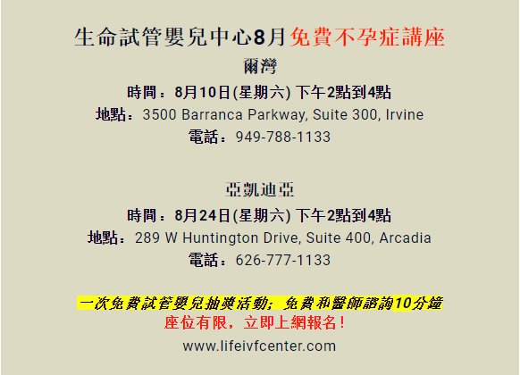 生命試管嬰兒中心誠心幫助您圓滿生兒育女的願望,將於8月舉辦兩場免費不孕講座,10日在橙縣爾灣中心,24日在洛杉磯亞凱迪亞中心,由院長葉練醫學博士(Dr. Frank Yelian)親自主講,帶您深入了解不孕症的各種病因,以及介紹獨創的個性化精準試管嬰兒,病人甚至可以不吃藥打針就能成功懷孕。所有參加者皆可和醫師免費諮詢以及參加現場抽獎,幸運者可贏得一次價值數千元的免費試管嬰兒治療。座位有限,有意者請儘速上網報名。