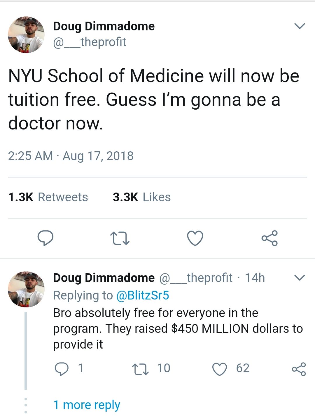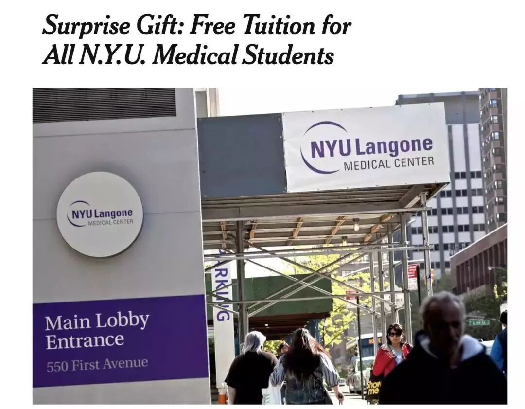 NYU医学院的学生一年学费大概约5万5000美元,毕业时每人平均负债18万美元。为了免除学费,纽大需支付6亿美元的资金,而幸运的是,NYU医学院已经筹集到了4.5亿美元的捐款,其中1亿美元,来自于Home Depot的创始人Kenneth Langone和他的妻子Elaine Langone.