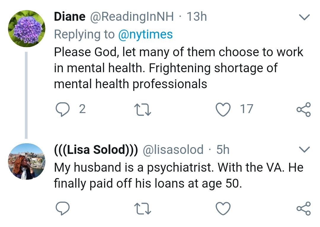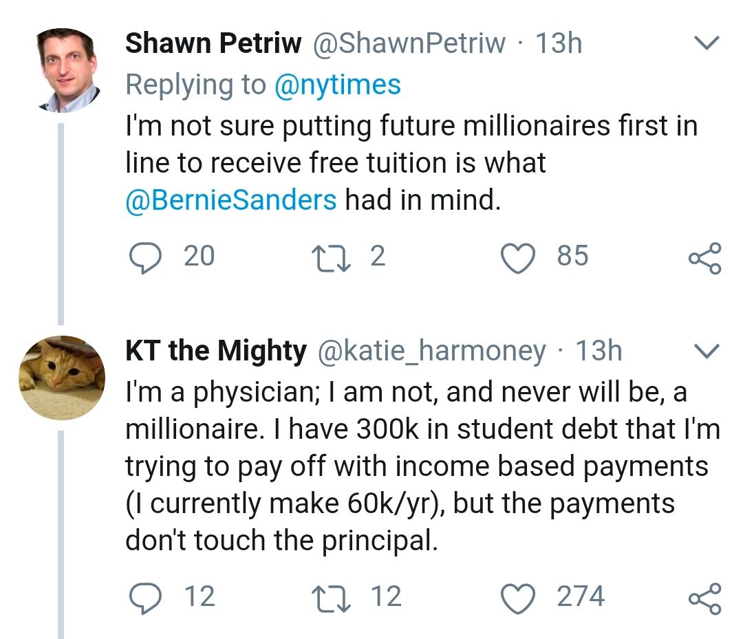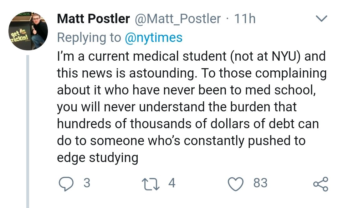 有网友表示,学医的出来挣钱,分分钟变成百万富翁,对他们这么好真的没必要。然而,这样的言论分分钟被还在付学生贷款的怼了回去,得到的点赞差不多是前者的三倍。