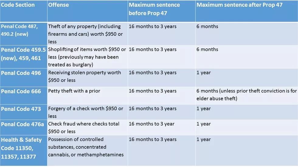 2014年11月加州公投通过的47号法案,该法案把持有毒品、偷窃、商店盗窃、身份盗窃、接收赃物、写假支票、伪造支票等罪从重罪改成了轻罪。950美元以下的盗窃,即使屡次犯法,每次被抓都可定为轻罪而无须入狱。