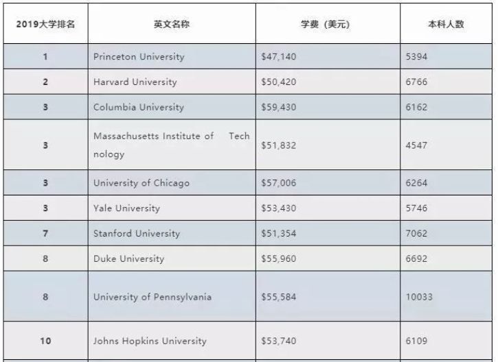 今年年初,USnews对美国的约2000所大学的学费进行了统计,以下是前10名学费最贵的大学学费情况(学费一栏数据为每学年的学费统计):