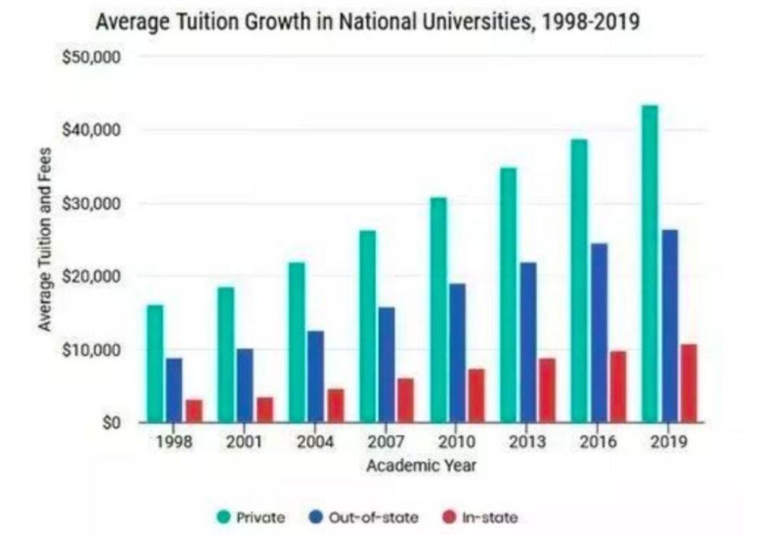 比这还要可怕的是,这个增速已经延续20年了,20年间美国大学的学费,可谓一路升升升升...