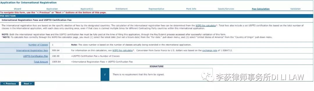 但同时,想要在其他国家得到保护,费用方面却并不菲。在表格最后,系统会自动帮你计算出此次申请需要花费的费用,费用由两部分构成:国际注册费以及USPTO证明费。