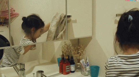 片中4岁的小女孩,自己起来刷牙洗脸,刷完会把毛巾整理好,会用手去摁紧水龙头,把折叠凳子收起来;