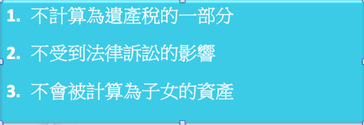 这种信托,因为所有权脱离了自己,也无法对放入其中的资产做任何处理。所以在这种信托里,大多数时候是放传承型的人寿保单。