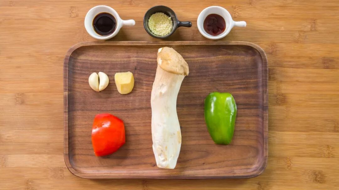 备菜准备:杏鲍菇洗净切片,青红辣椒切块,姜蒜切片备用。